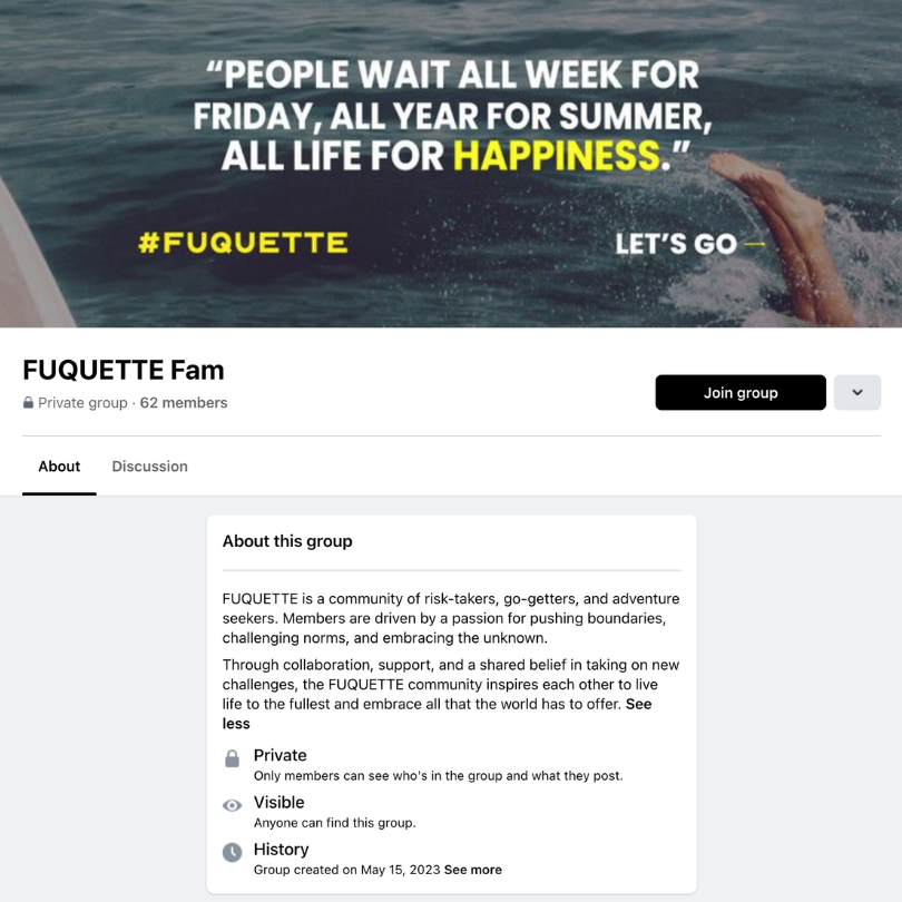 Join the FUQUETTE fam on Facebook: Connect with like-minded individuals, share your bold journey, and be part of a community that celebrates fearless living.